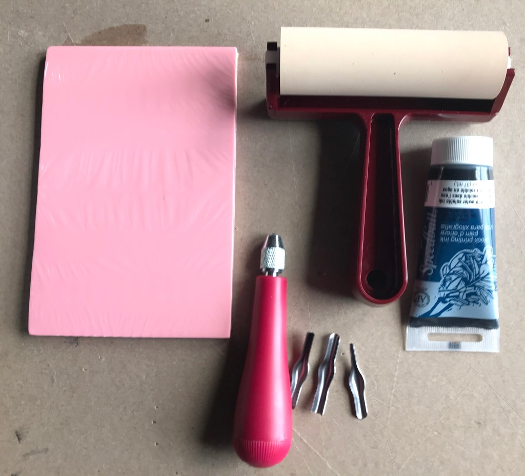 Starting from the top left and moving clockwise: a 6 x 4 inch cutting block, a brayer (roller), water soluble black ink, and a cutting tool with three blades.